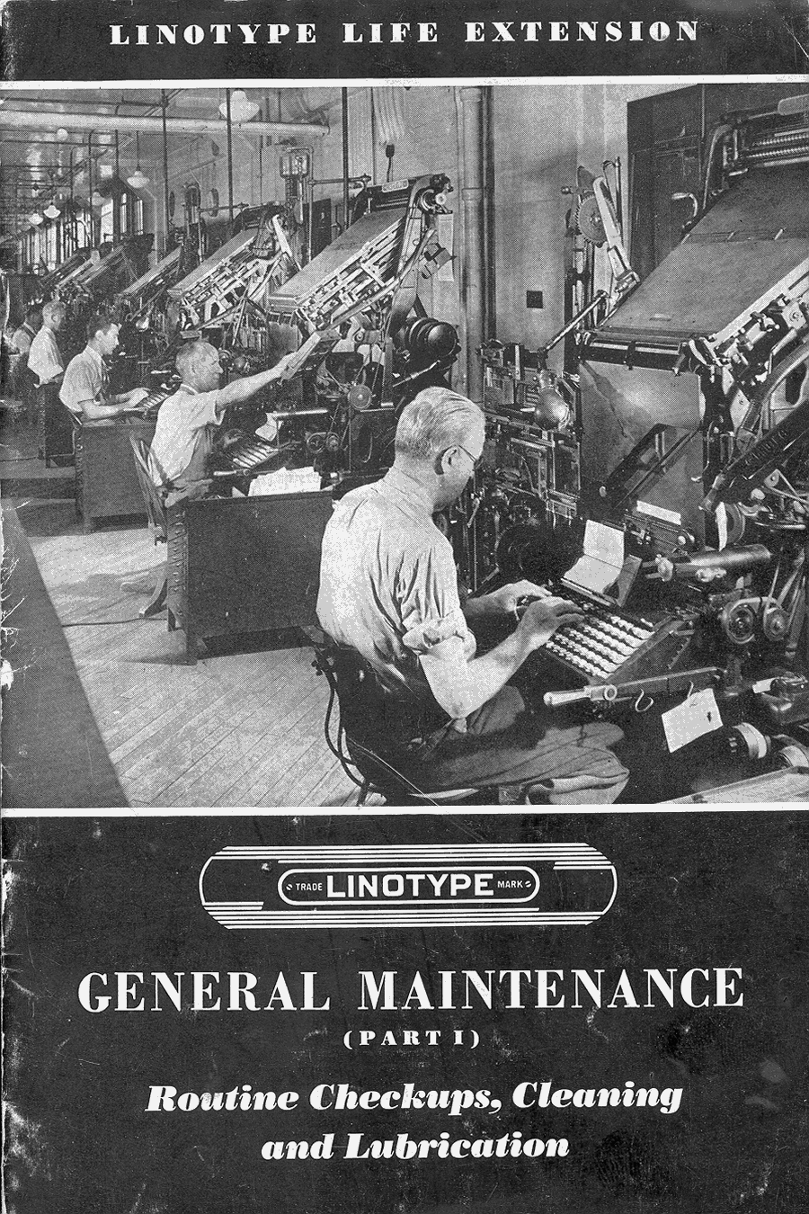 Hence, this series of Linotype booklets, devoted to conservation of machines and equipment -Linotype Life Extension, emphasizes the value of a careful program of maintenance. Routine checkups should be as much a part of Linotype operation as seeing that metal is in the metal pot and copy on the copy holder.
