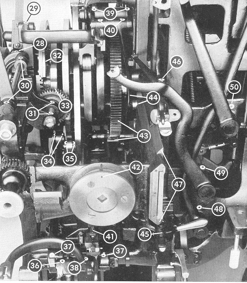It is not possible to indicate the desirable frequency, of oiling individual points on the Linotype, as is practicable in the case of an automobile. The widely varying conditions under which Linotypes are operated, with respect to running time, cleanliness and climate, combine to make it a problem best solved locally, through the exercise of simple mechanical judgment. It should be sufficient to point t out that the constantly moving parts call for more frequent attention than those which only contact when the machine makes its periodic cycles.