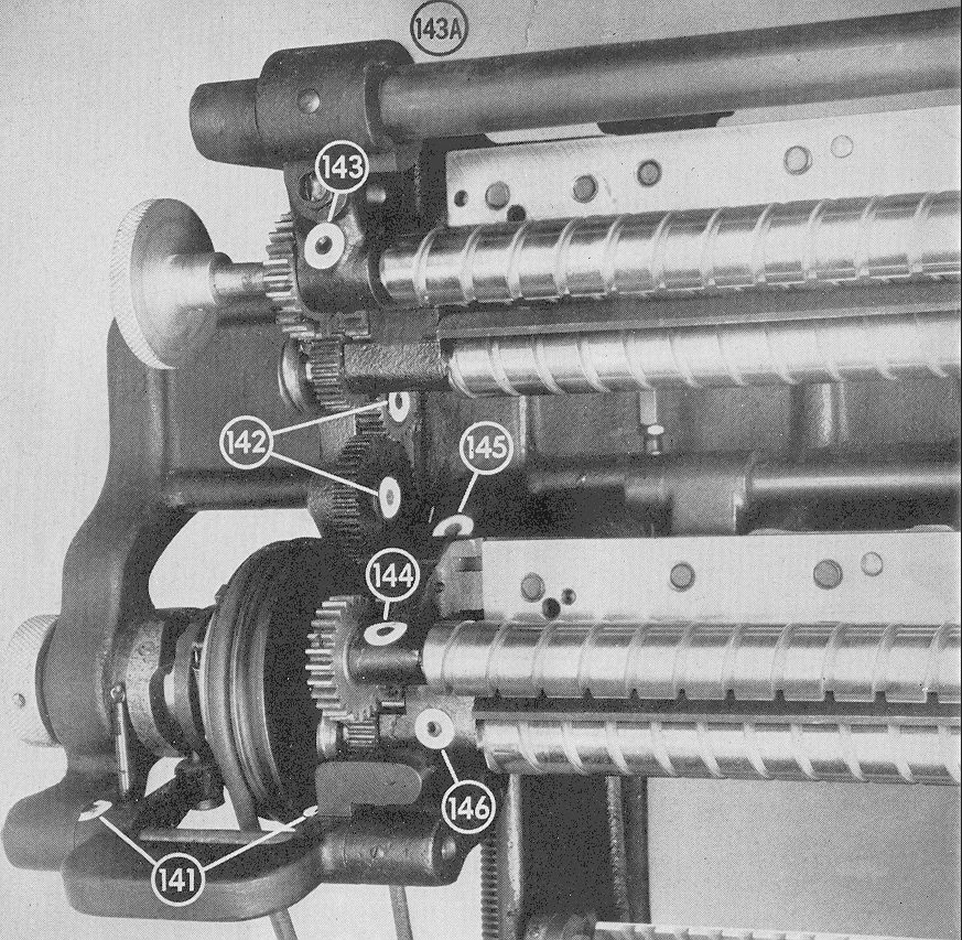 143a Distributor Front Screw (Upper Set) and Distributor Lower Screw (Upper Set) Oil Holes (4) (one hole at each end of each screw-visible from top of machine) (Models 29 and 30) t